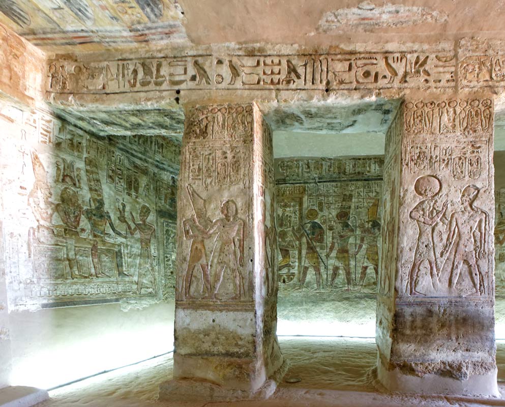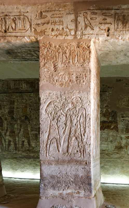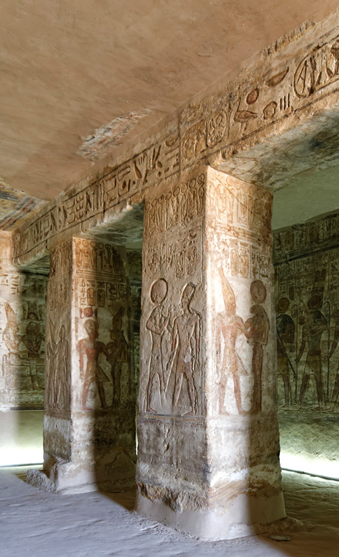 L'architrave Ouest côté Est énonce les titres de Ramsès II : "Vive l'Horus, Taureau puissant, aimé de Maât, Celui des Deux maîtresses, celui qui protège l' Égypte, celui qui soumet les contrées étrangères, l'Horus d'Or, Celui dont les années sont puissantes, celui dont victoires sont grandes, le Roi de haute et de Basse Égypte, le Maître des Deux Terres, .." (voir ci dessous)
