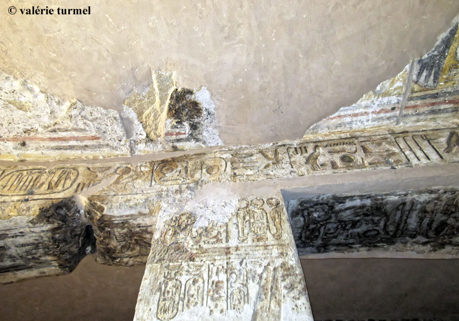 Une partie de la suite du texte de l'architrave est visible ici : " .. Celui dont les années sont puissantes, celui dont les victoires sont grandes, le Roi de Haute et de Basse Égypte, le Maître des Deux Terres, <Ouser-Maât-Rê> , le fils de Rê, le Maître des apparitions (ou des couronnes), <Rê-Messou-MeryAmon> .." Le teste final déclare que le roi a fait pour son père Amon un grand temple de millions d'années.