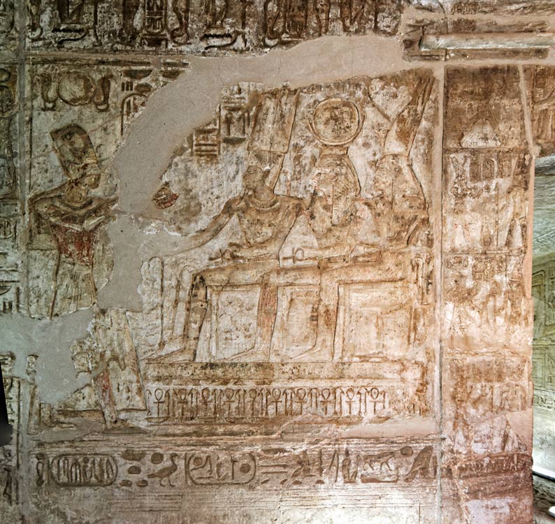 -Scène de gauche : le roi Ramsès II reçoit la vie d'e l'Horus de Miam qui lui tient la main.