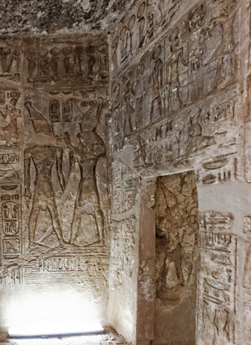 La porte est richement décoré : au dessus du linteau, le roi offre du vin à Isis à gauche et la Mât à Hathor à droite. Sur le linteau, 2 sphinx royaux encadrent les cartouches de Ramsès II. Sur les jambages, des titulatures royales: à gauche, le roi est dit: "aimé d'Isis..." et à droite, "aimé d'Hathor.."