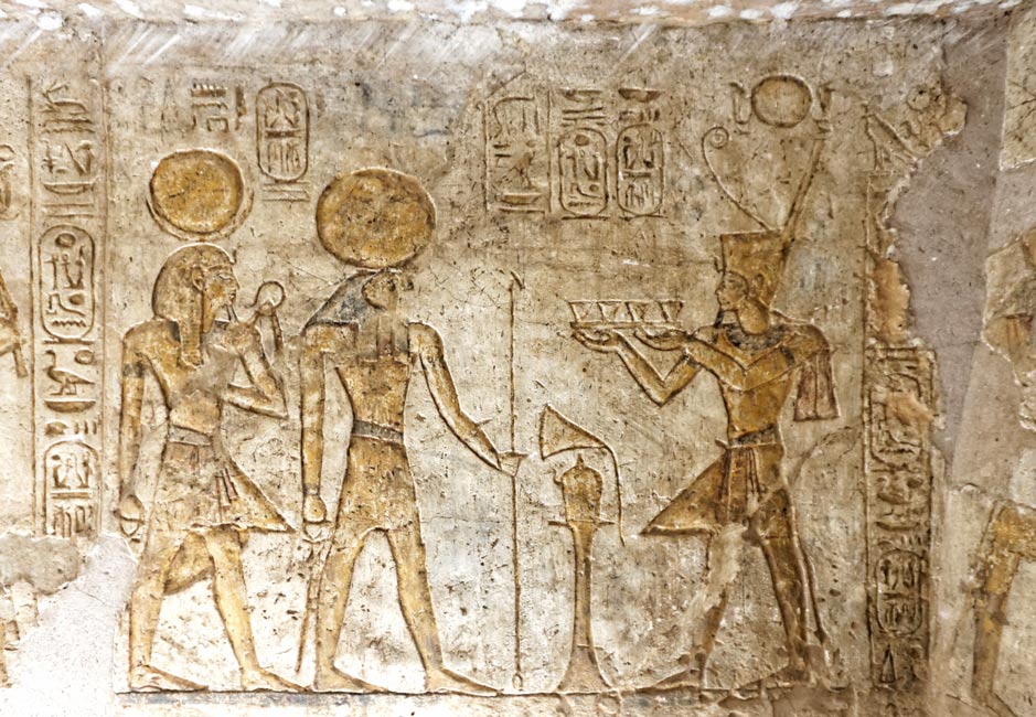 Le roi Ramsès II offre les 4 vases à Rê-Horakhty et Ramsès II divinisé.