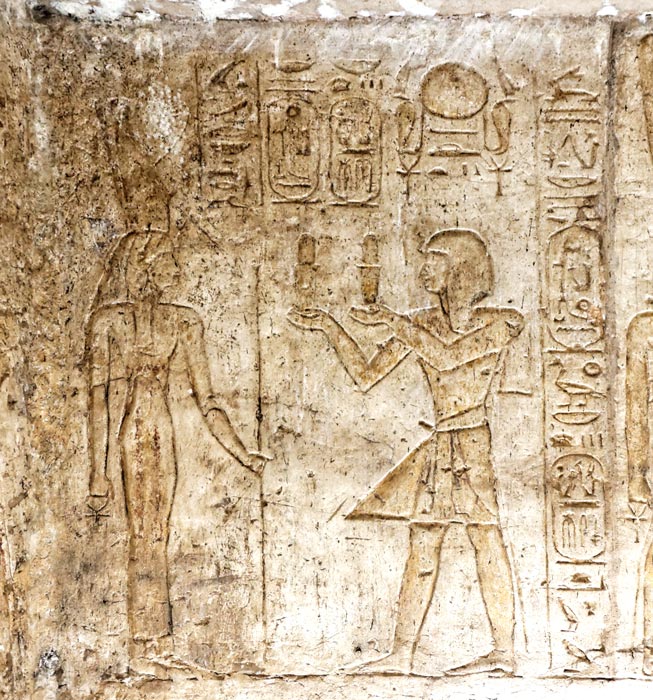 Le roi offre à Atoum deux figurines, un dieu et un sphinx. Le dieu lui donne toute la bravoure.