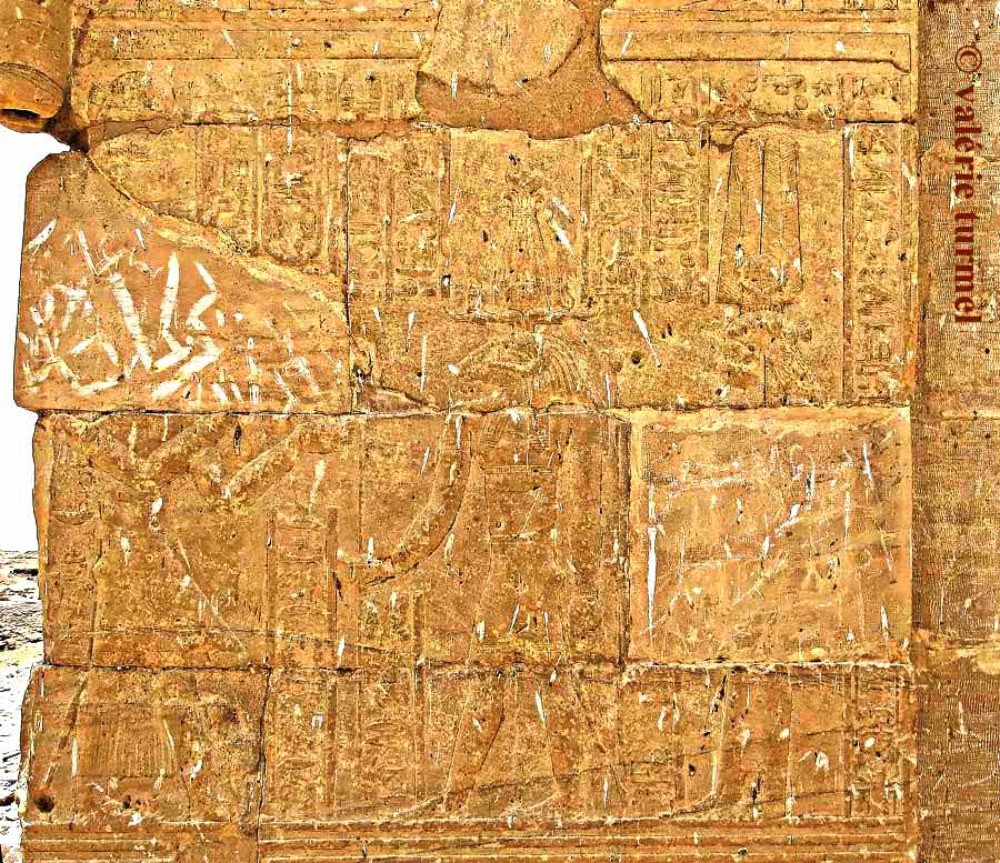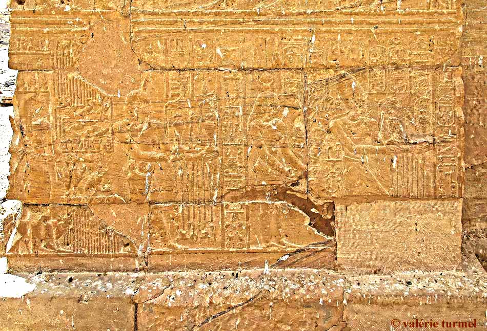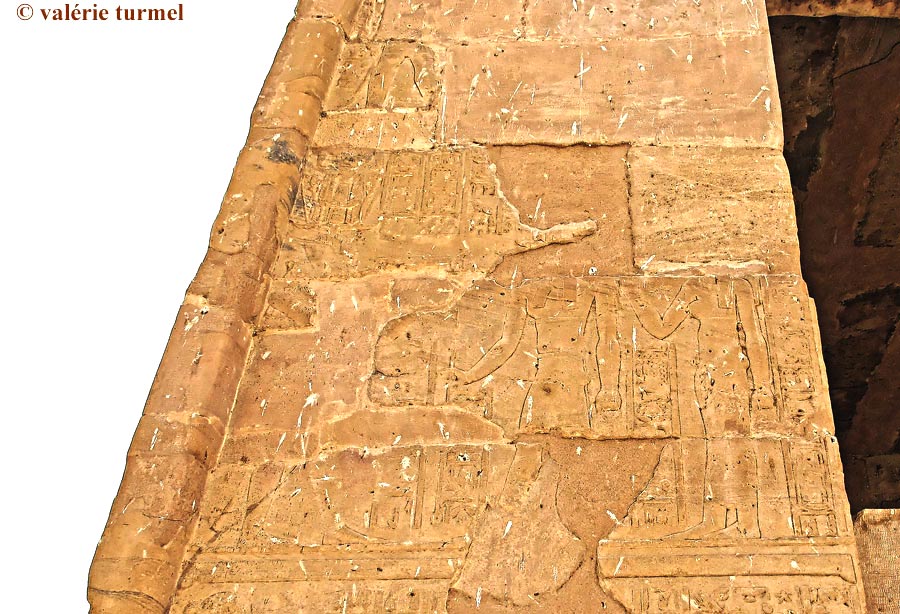La scène du haut du montant est difficilement lisible. Elle représente le roi, Chou et Tefnout. Sur la scène en dessous, on aperçoit encore des silhouettes. Le roi Ptolémée VII offre une palette à Thot accompagné d'une déesse..