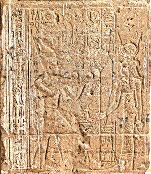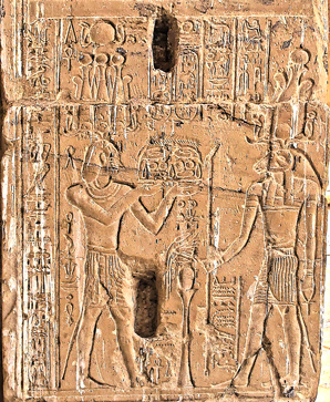 Le roi offre un plateau de nourritures à Harendotes, fils d'Isis. Le dieu lui donne en retour les produits sortis des champs.