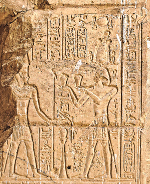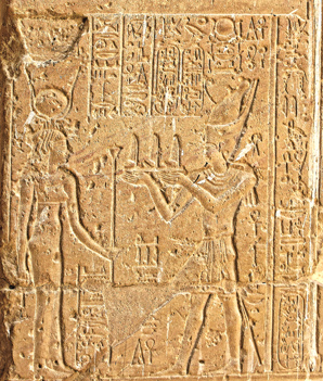 Le roi offre de la nourriture à Khnoum qui lui donne Hapy (le Nil).
