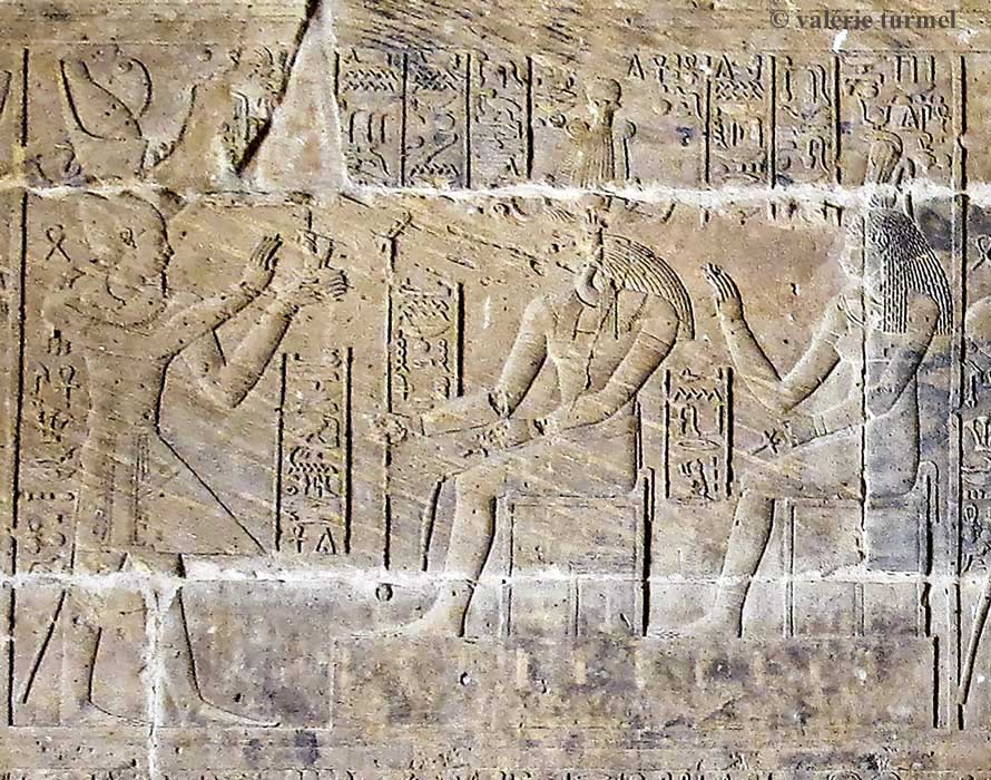 Le roi offre la Maât à Thot de Pnoubs et à Oupset. Thot lui donne une éternité comme roi du double pays.et toutes les faveurs dans tous les coeurs. Oupset place la flamme contre ses ennemis.
