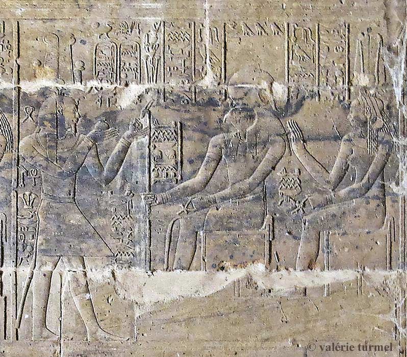 Le roi fait l'offrande du vin à Horakhty et à Hathor.