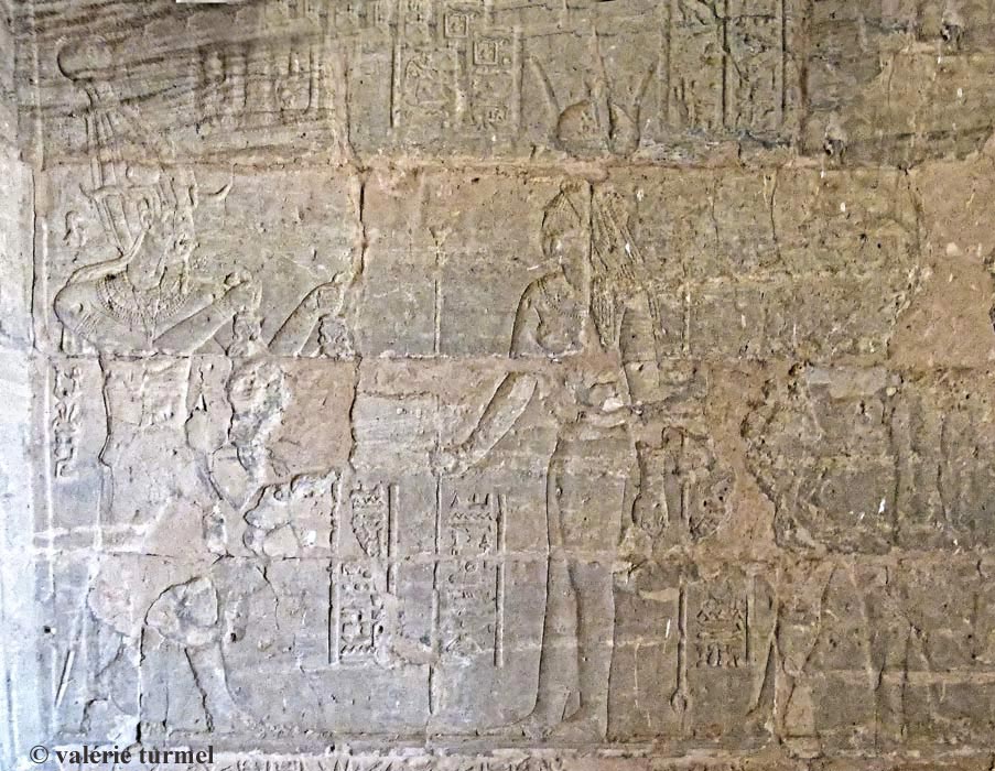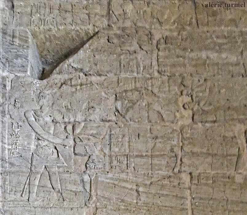 Registre du bas, côté Nord : le pharaon le collier en argent et en or, pourvu (?) de toutes les vraies pierres à Isis et à Horus d'Edfou. Isis lui donne l’Ouest et l’Est placés sous son prestige. Horus lui donne le Sud et le Nord. Les autres scènes de cette paroi sont très dégradées.