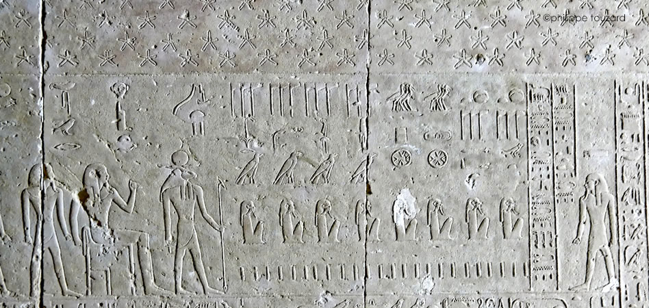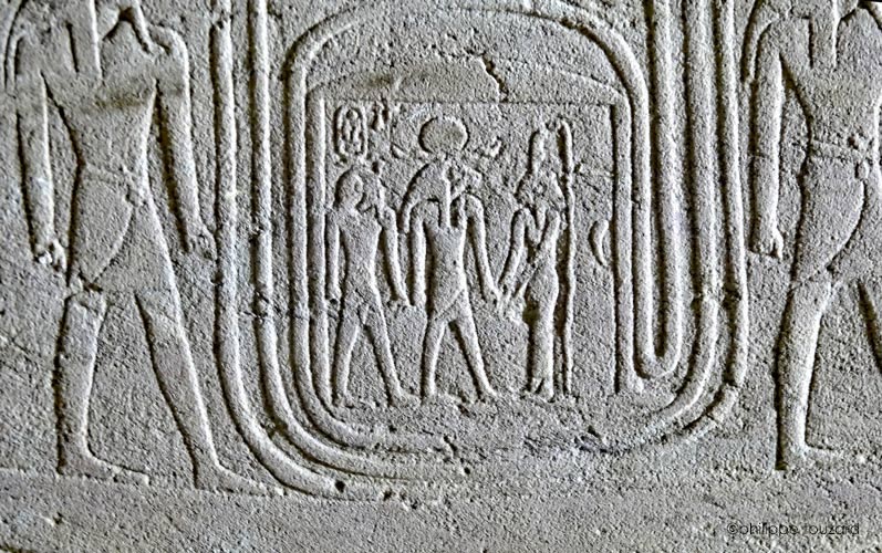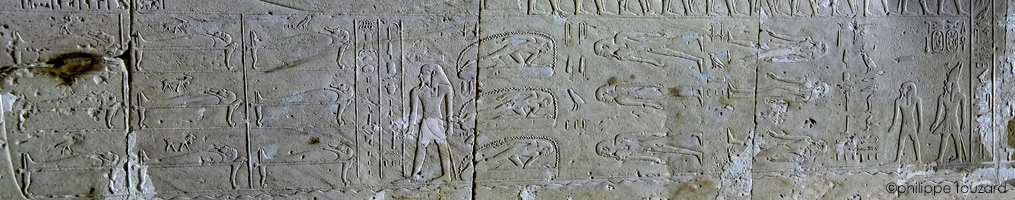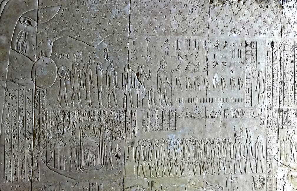Sur le registre du haut, s"avancent une file de divinités : les Baou de nekhen, les Baou de Pe, une Ennéade, lea Grande Ennéade et les dieux des 4 points cardinaux.