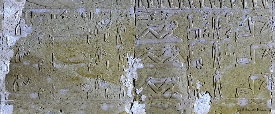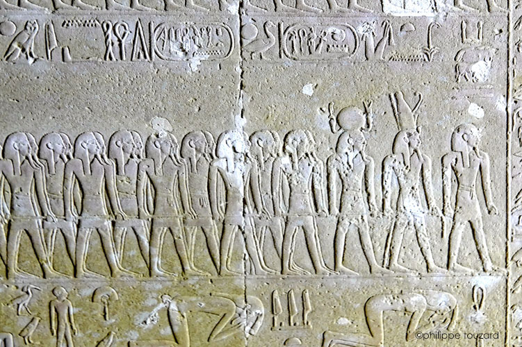 Dans le registre du bas sont représentés "ceux qui sont éveillés, ceux qui sont endormis, ceux qui sont silencieux, ceux qui sont ressuscités, ceux qui sont noyés, les esprits, les ombres, des pleureuses ( ?)..". (de gauche à droite). Certaines silhouettes sont des femmes.