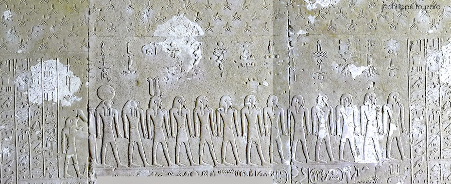 Sur le registre du haut, s"avance une file de divinités de la Douat La scène se trouve entre la deuxième porte à gauche et la troisième à droite. La deuxième porte , en flammes comporte du matériel brûlant : éblouissante, elle tue rapidement ceux qui ne peuvent pas passer.