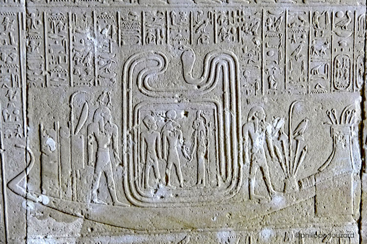 Dans le naos, Rê à tête de bélier est entouré de Maât devant lui et Sethy derrière.