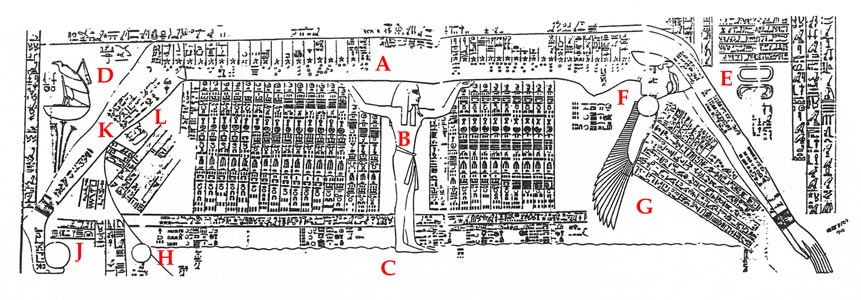 Le soir, le soleil (F) est avalé par la déesse et le matin, il renaît en sortant de Nout.(K). Le soleil naissant est sous la forme d'un scarabée ailé (kheper) (L). Le soleil est également représenté juste en dessous de l'horizon (H) et apparaît (J) aux pieds de la déesse,. C'est le monde visible dans lequel se meut le soleil. La déesse Nekhbet , protectrice du sud, est sur la gauche (D).