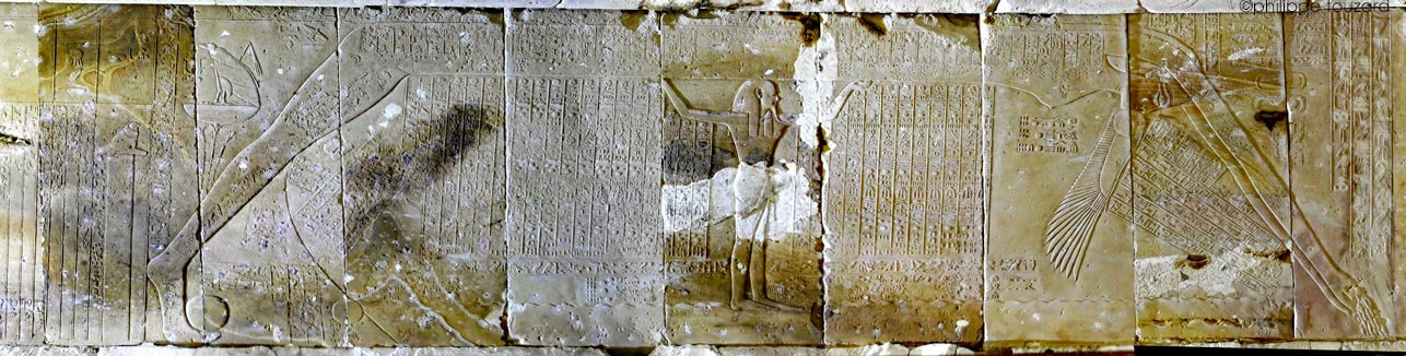L e roi D'après les textes sacrés, le soleil sort au matin du ventre de Nout. La scène présent aussi la version plus proche de la réalité où le soleil est sous l'horizon (la ligne courbe ?) et apparaît ensuite au dessus. À gauche, sur une corbeille, la déesse Nekhbet protège la scène. Encore plus à gauche, le dieu Horus est posé sur une colonne : à côté du dieu, le texte donne le vrai titre du livre : Principes fondamentaux de la marche des étoiles" (A. von Lieven citée par A.S.von Bonhard).