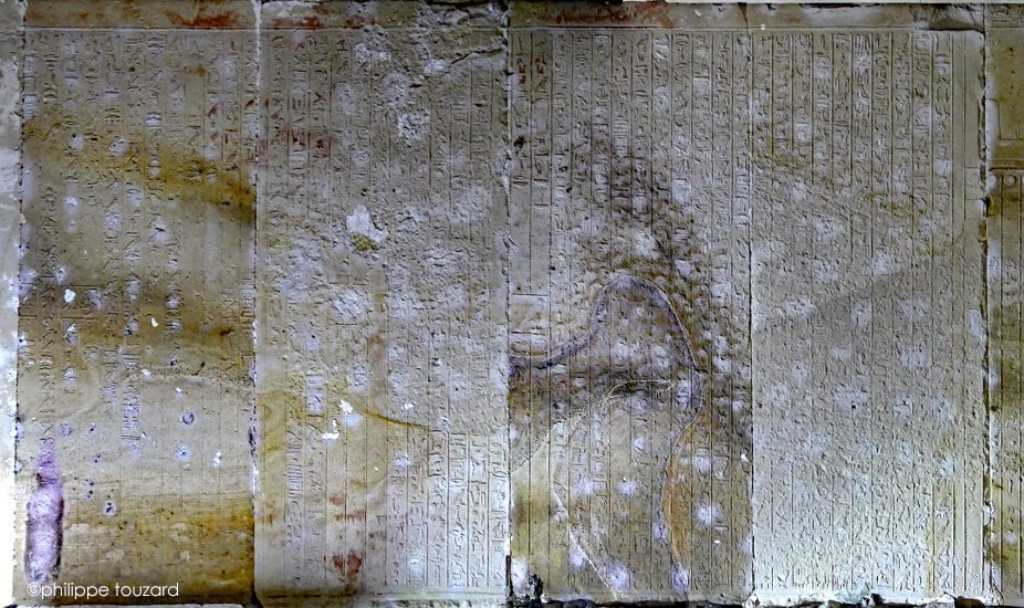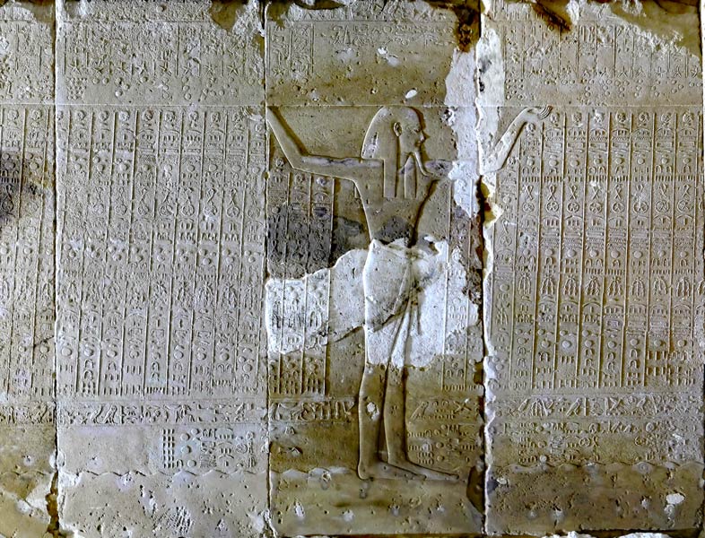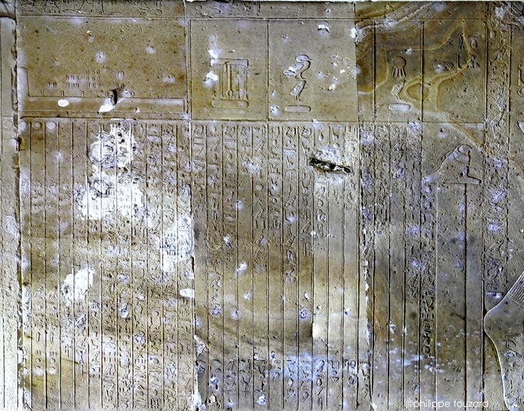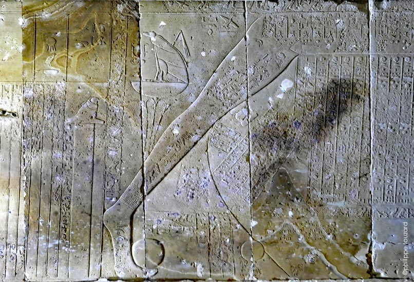 Ce dessin a été reproduit du livre de M. Clagget , d'après Frankfort (The cenotaph of Seti I at Abydos, London-1933). Les lettres sont de Traunecker (2005) et ont été rajoutées sur le dessin.