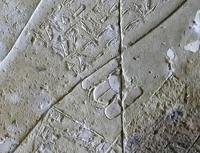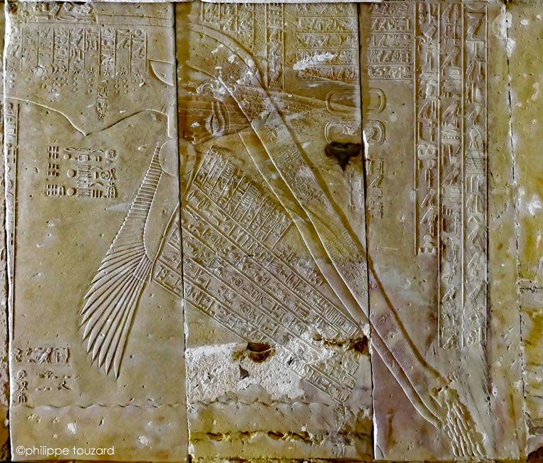 En dessous la bouche de Nout, le texte explique que le soleil entre dans la Douat par la bouche de Nout. Cette scène est représentée ici, le soleil ayant encore ses ailes déployées.
