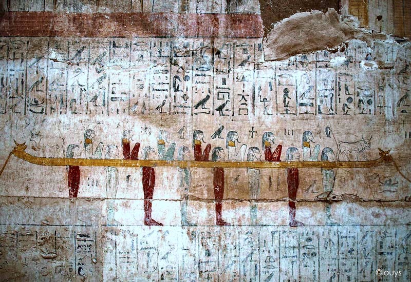 Sur le registre inférieur, différents dieux luttent contre des serpents, dont Apopis.