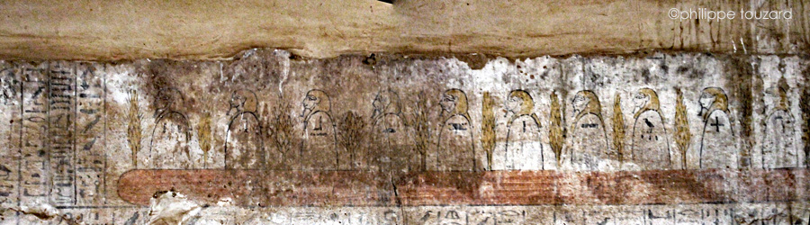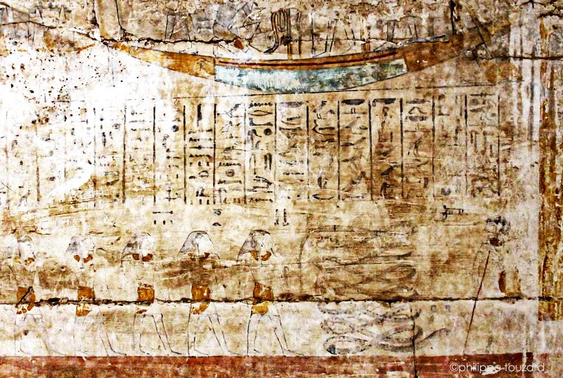 Les 4 haleurs tirent ici l'ensemble formé de la Barque solaire et de la Terre. Quatre personnages bras croisés sont enveloppés d'un linceul. Atoum et Geb, dieu de la Terre sont liés par la corde du halage qui entre par la tête de droite et sort par la tête de gauche du tube?