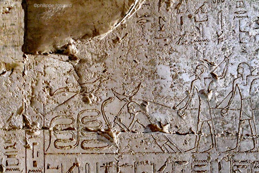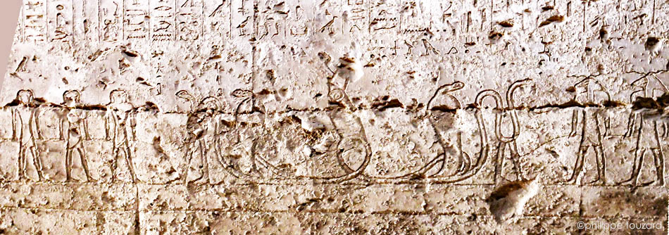 Sur le registre inférieur, Khepri est représenté sous forme d'un serpent qui se déplace grace à deux groupes de personnages. (voir ci-dessous)