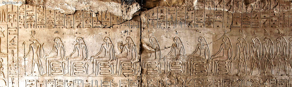 4 dieux, le dos recourbé, adorent et prient le dieu Rê.