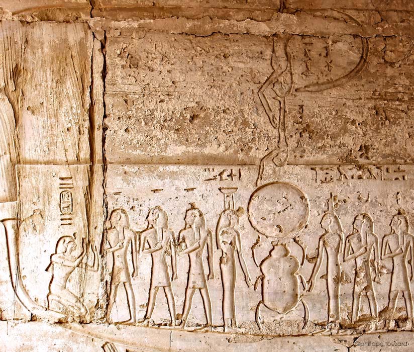 Le soleil, sous forme de scarabée est entouré de Nephtys et Isis. Derrière Isis, se trouvent Geb (avec son oie caractéristique), Chou, Heka, Hou et Sia. À gauche, le roi fait le signe de l'adoration.