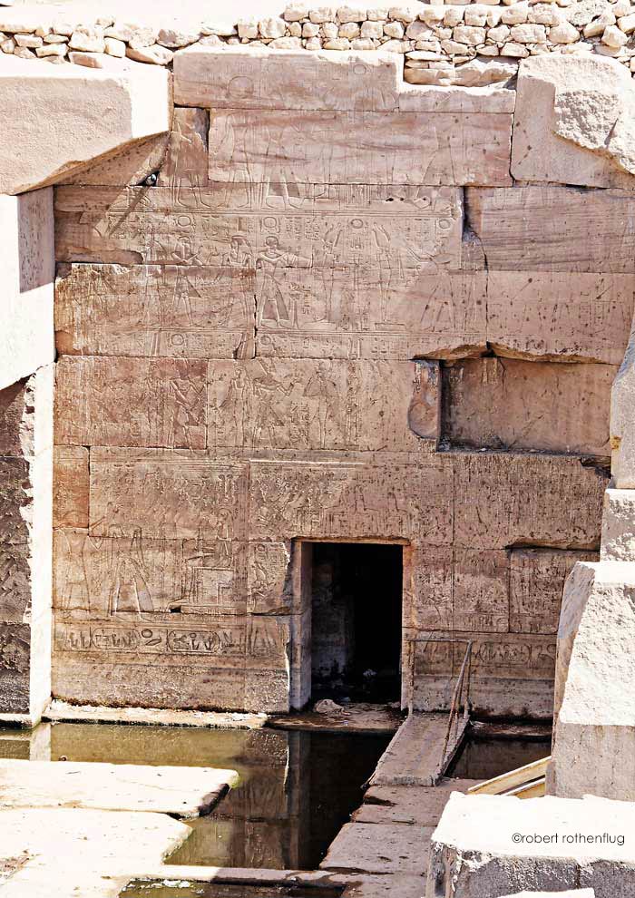 La paroi Est du hall constitue la façade de la salle du sarcophage dont on voit la porte décorée. Le panneau est décoré de petites scènes, montrant le roi faisant des offrandes à différents dieux et déesses. De l'eau stagne sur le sol de l'Osiréion, remontée de la nappe phréatique.