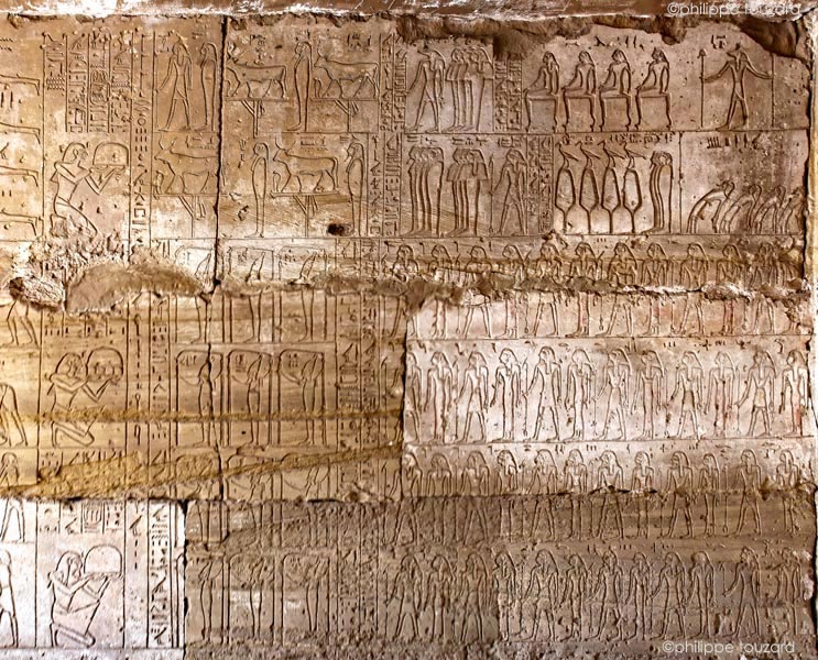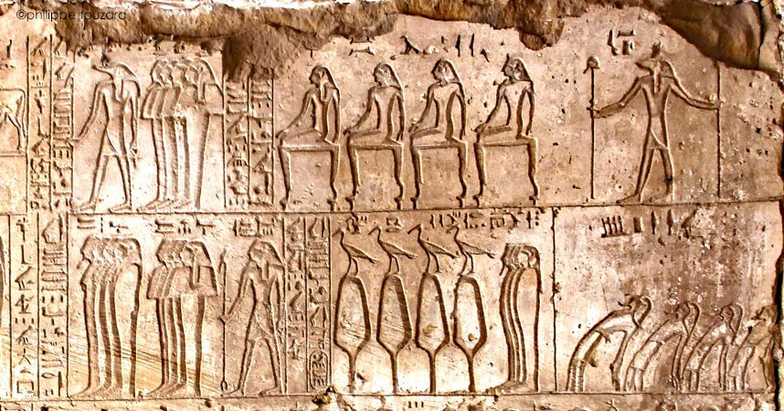 Un dieu à tête de crocodile porte le sceptre Ouas d'une main et le signe ankh dans l'autre. Il est suivi de 4 personnages momifiés.