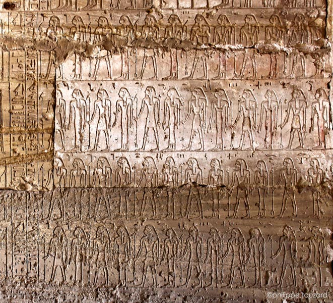 Les 'Osiris' sont suivis de 4 rangées de dieux . Les divinités sont au nombre de 12 par rangée, alternativement dieu et déesse. Les dieux portent le sceptre Ouas d'une main et le signe ankh dans l'autre. Les déesses tiennent seulement le signe Ankh. Ceux sont ceux qui suivent Osiris. Les 4 rangées sont identiques.