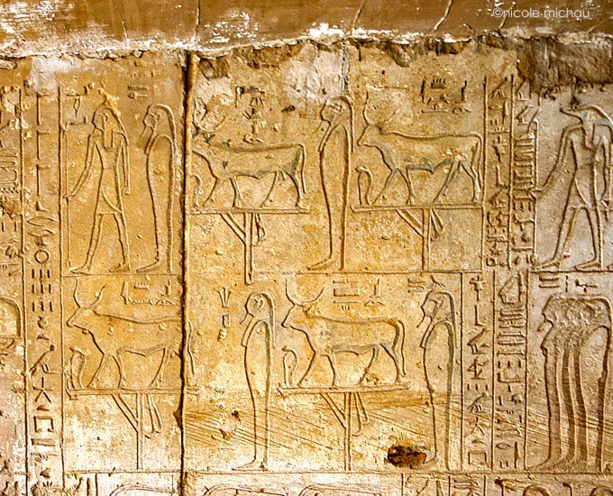 En haut, à gauche, le dieu tenant le sceptre Ouas serait le génie protecteur Âhâ (Corteggiani; 2007, p.14). Le dieu momifié derrière lui porte le nom de "Secret". Du nom du taureau sur un pavois avec un uræus, il ne reste qu'Osiris. Puis un autre personnage momifié sans nom et un taureau identique appelé "Imen-Ousir", Osiris caché. En dessous,