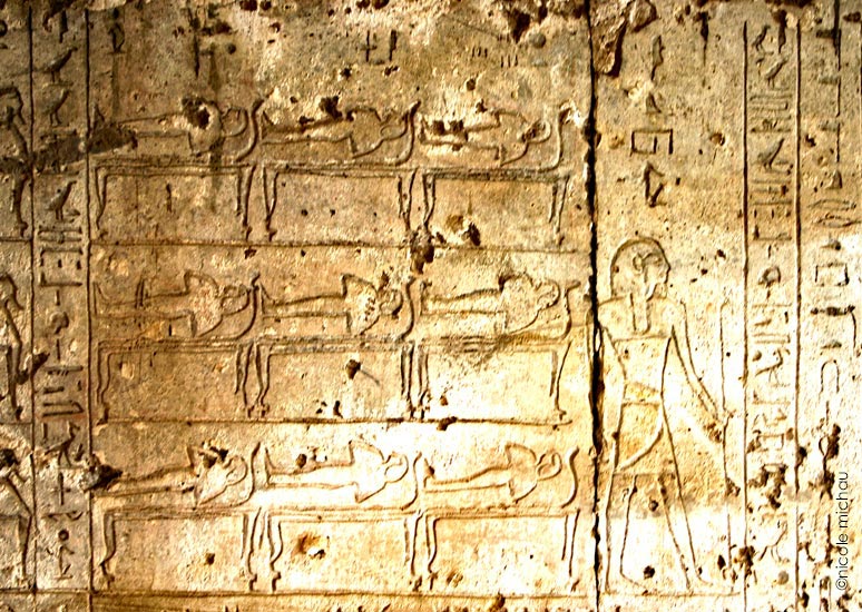 Neuf personnages dans une position curieuse sont l"s corps des Osiris cachés.