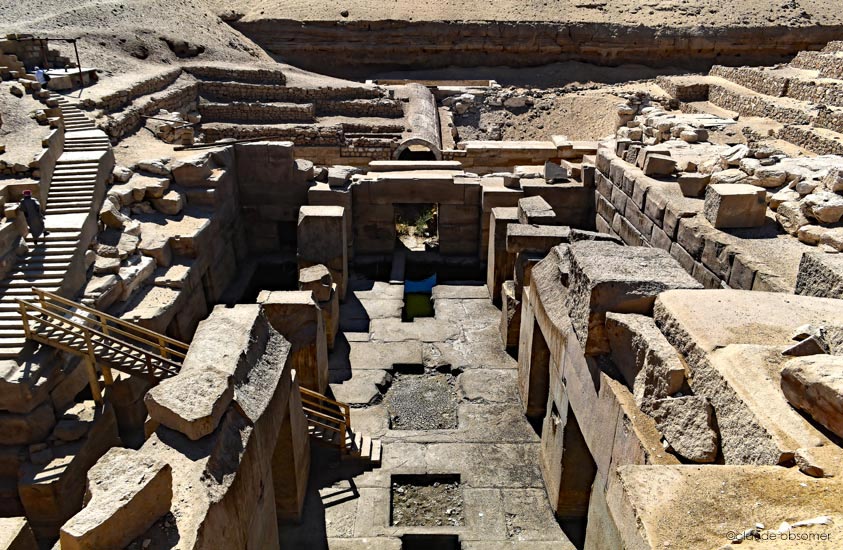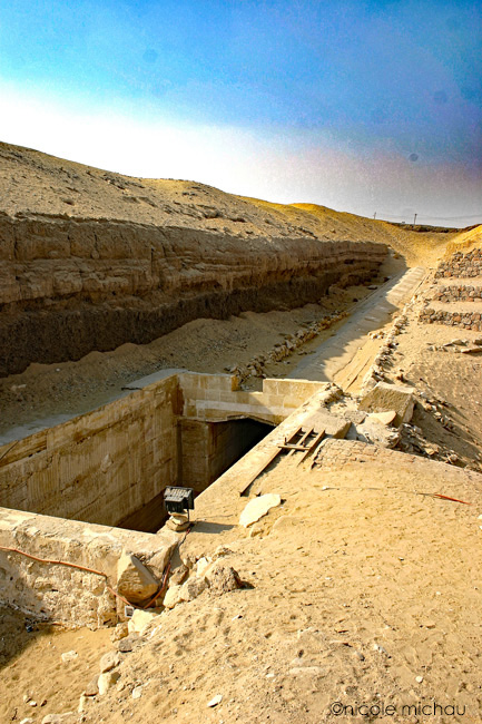 Un passage en pente permet de relier l'antichambre et le hall central, visible ci-dessus en haut de l'image. Le hall central est ici vu à sec. Il est flanqué de la salle du sarcophage.