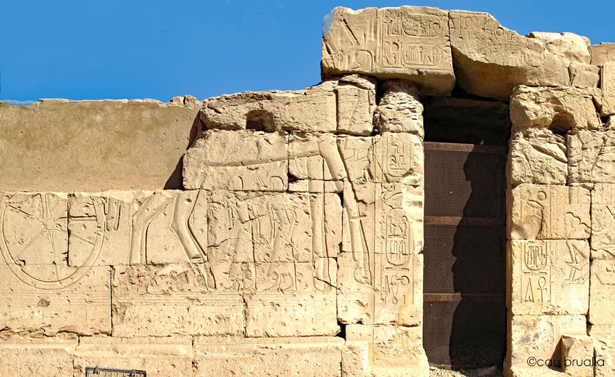Sur la paroi Sud de la première cour sont représentés des extraits de campagnes militaires de Ramsès II.
