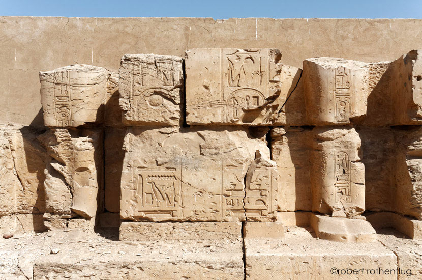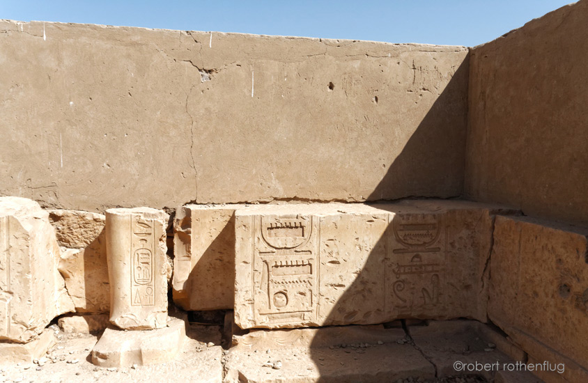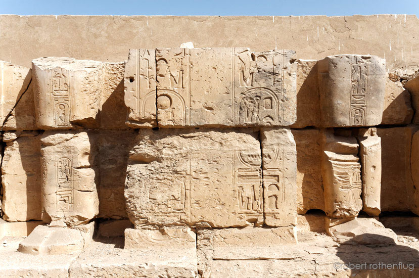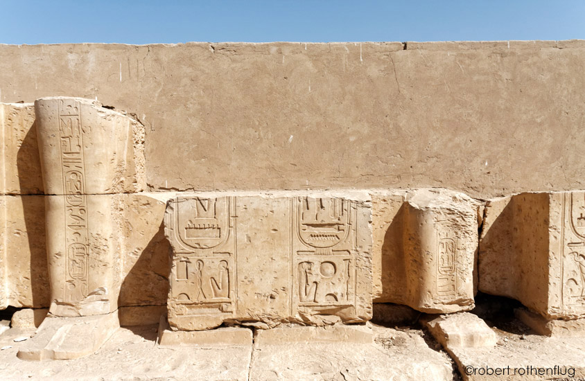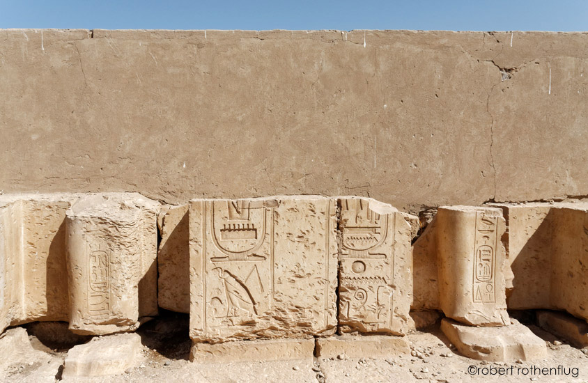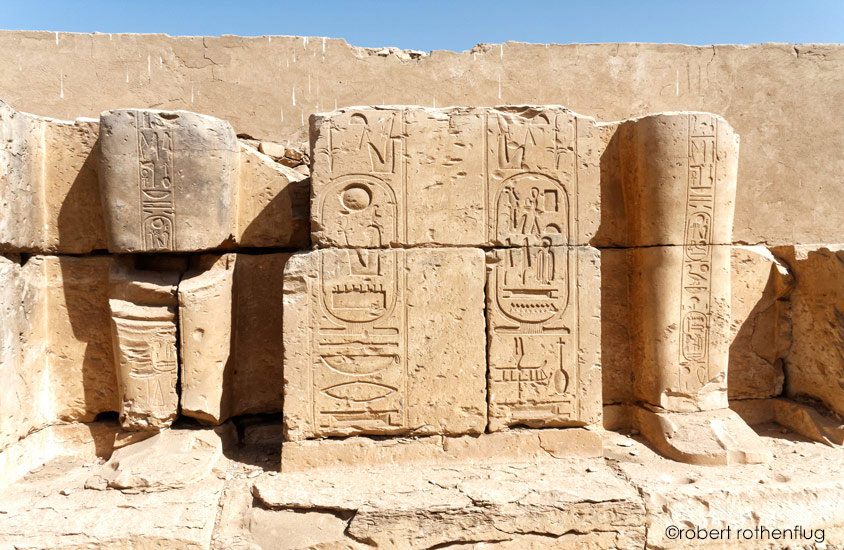 Sur le panneau, le nom de Amon-Rê à gauche et celui de Atoum à droite. Trois des têtes des piliers seraient entreposées dans la première salle hypostyle