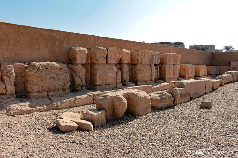 Vestiges des piliers osiriaques côté Est au dos du pylône dans la première cour :
