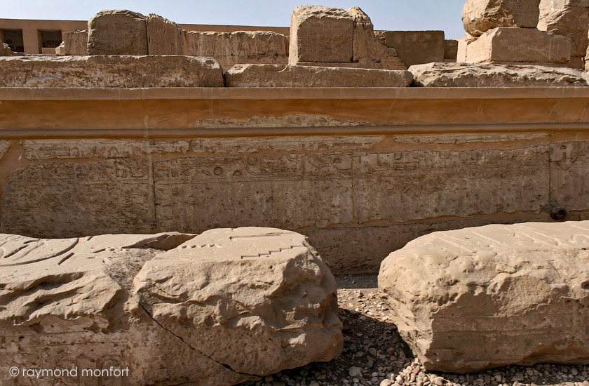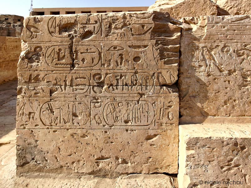 Ce bloc qui faisait partie de la porte comporte les titulatures de Merenptah sur les 2 registres du haut. En dessous, celles de Ramsès III,: 'Puissante est la Maât de Rê, L'aimé d'Amon', puis le nom de fils de Rê . Puis en dernier, celles de Ramsès IV : 'Puissante est la Maât de Rê, Celui qui a été choisi par Amon'.