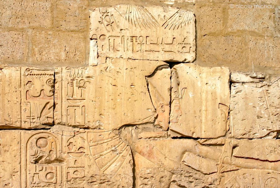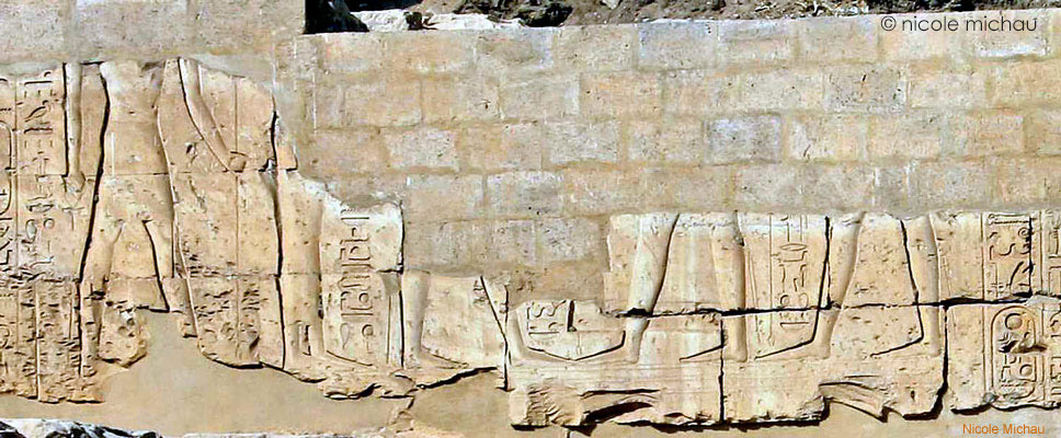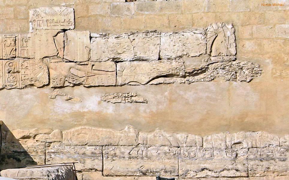 Seconde scène : Ramsès II chevauche sur un char, une épée dans sa main droite. Son cheval est nommé :"Victoire dans Thébes". (R. David, 1973, page 19).
