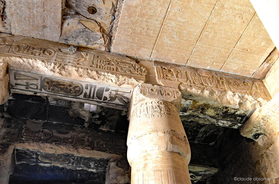 Le chapiteau, en lotus fermé, comprend une frise et son abaque un court texte."Le dieu parfait (Ouser Maât Rê, Setep n Rê)I doué de vie". (Puissante est la Maât de Rê, Celui qui a été choisi par Rê)I.