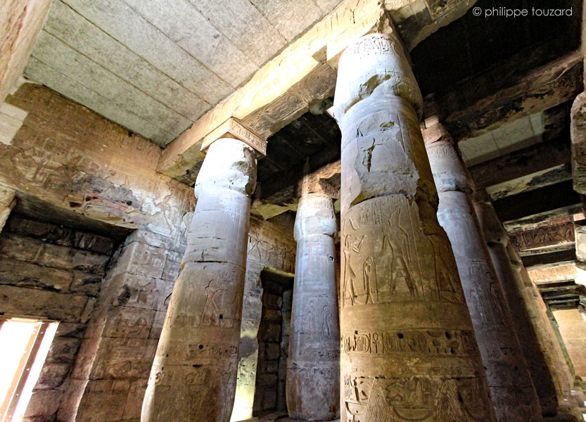 Les deux colonnes de la travée d'Horus suivies de deux des colonnes de la travée d'Isis.