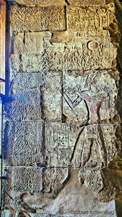 Sur la paroi sud de l'embrasure de la porte, Ramsès II encense un dieu avec un encensoir, peut-être Amon dont il reste un des signes du nom. Les deux figures de Ramsès sont tournées vers l'extérieur. |