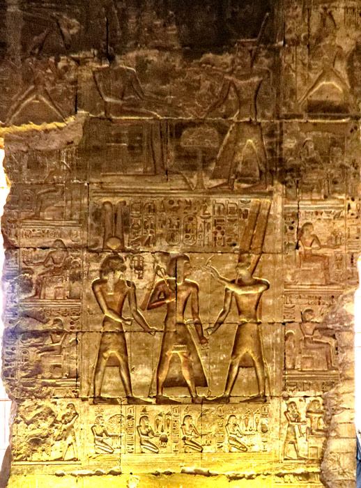 Dans la scène centrale, le roi et Sechat plantent des piquets pour délimiter le pourtour du temple sur le sol avec une corde, en présence d'Osiris. Sechat est également qualifiée de "Dame des bâtisseurs" dans les Textes des Pyramides et joue un rôle important dans la construction des temples.