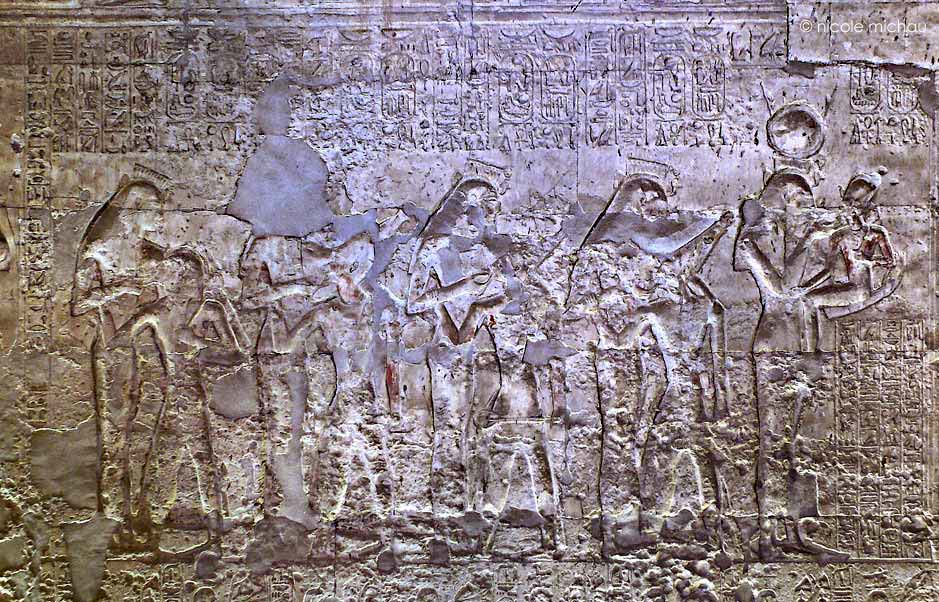 Le roi est nourri au sein de 4 différentes déesses Hathor qui résident dans Abydos. .La première Hathor est dite 'Hathor de Denderah'. La seconde est la Dame du domaine de Sekhmet et la troisième est la dame d'un autre lieu. Le roi renaît à la vie, étant un roi nouveau . A droite, Isis materne le roi. . (R. David, 1973, p. 34; 2016, p.52). La paroi est malheureusement très dégradée.