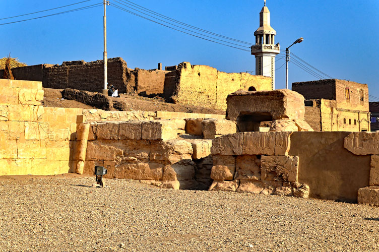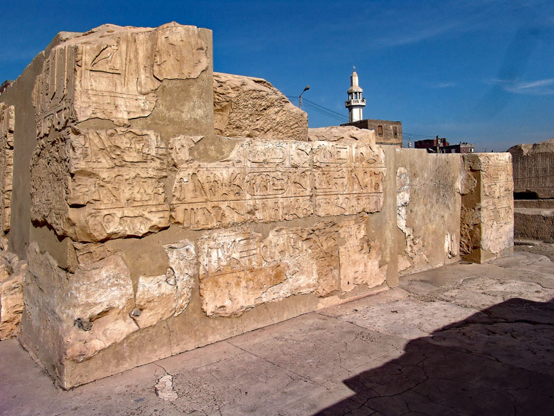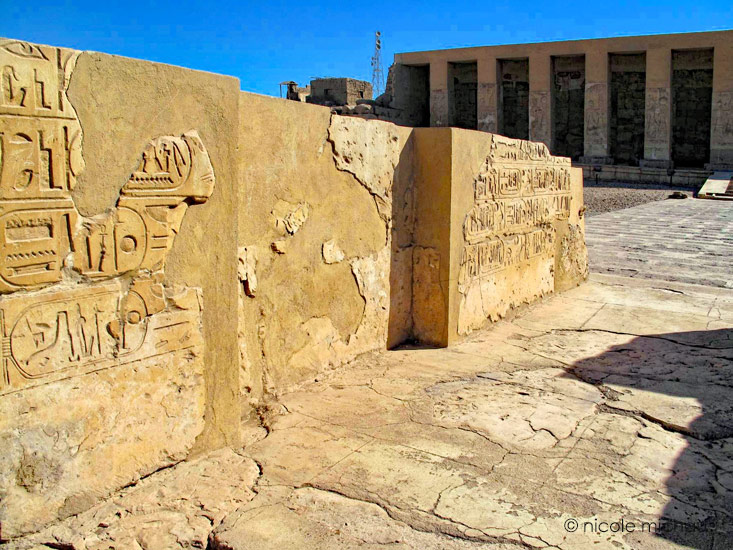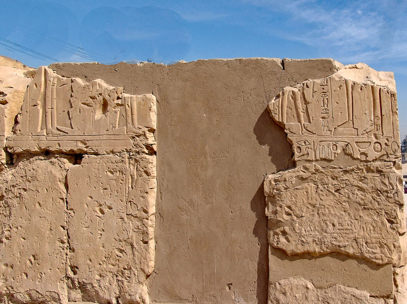 À droite, sur le haut de la porte centrale, Ramsès II se tient devant Osiris et une déesse.