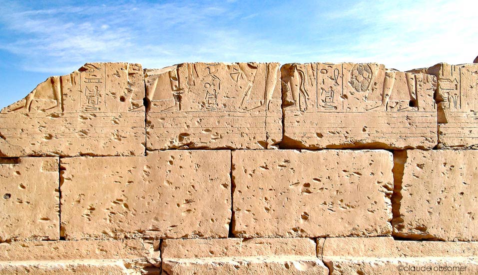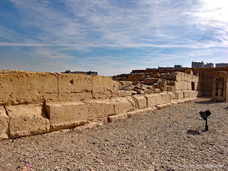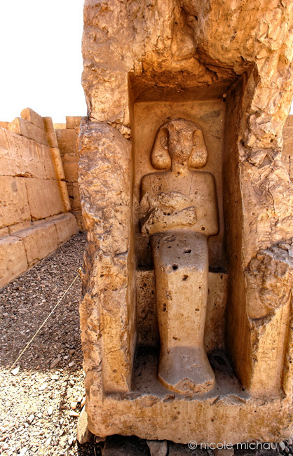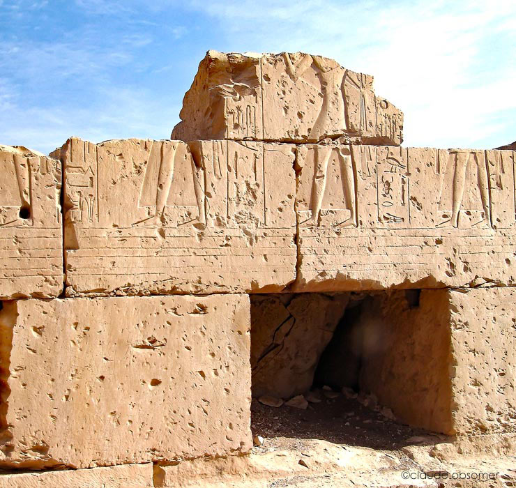 De ce c^té, comme du côté de la première cour, se déroulait le défilé des princes, fils de Ramsès II. dont il ne reste que des vestiges et aucune représentation complète, contrairement à l'autre défilé. Ces restes de scènes sont situés autour de la nicje au Sud. Dans la cour, un naos avec ue statue, anépigraphes, a été posé.. |