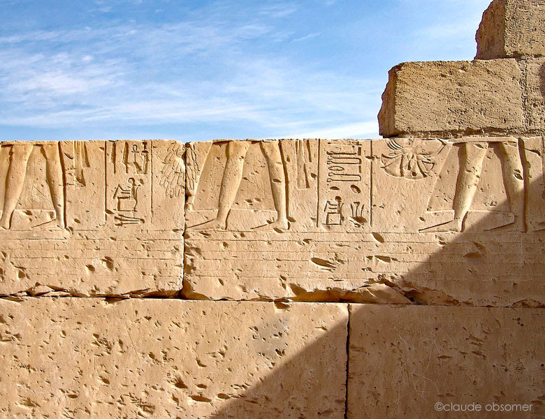 Seuls subsistent les jambes et quelques signes des 10 représentations restantes. À gauche, les premiers caractéres lisibles permettent de les attribuer à Ramsès Saatoum (41ème) d'après les hieroglyphes restants sa-tm. Puis le 33ème, nommé Pamsès..paRê, (.;pa-Rê)et puisd le 35ème Ramsès-MeretmiRê. (suite ci-dessous).