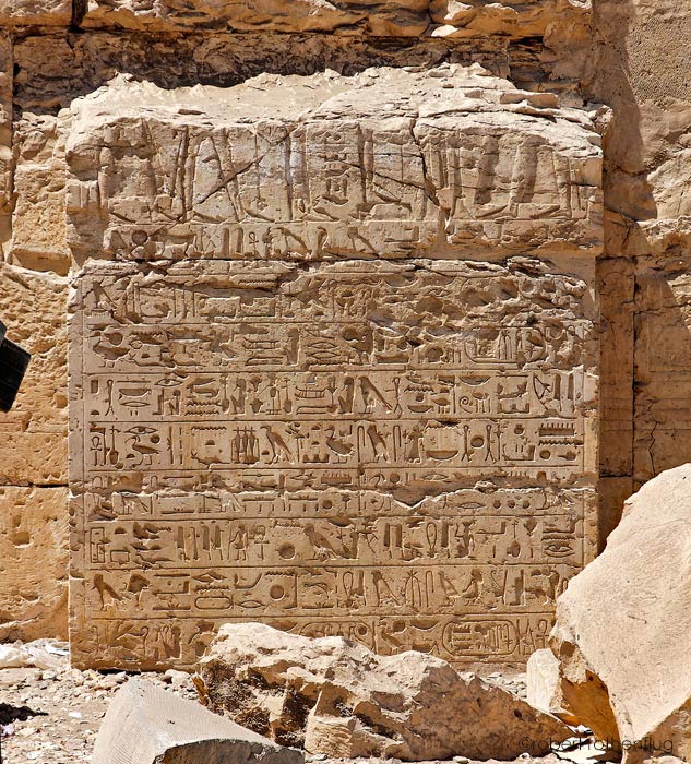 Stèle de la paroi nord : en haut, la scène détruite est probablement une offrande de Ramsès II à différents dieux. La ligne dessous cette scène est endommagée, mais elle donne le nom d'Horus du roi, suivi du nom des Deux Maîtresses. La titulature de Ramsès II continue sur deux autres lignes. Puis les lignes suivantes commencent par une énumération de dieux : Ptah-Sokar, Osiris-Ounennefer, ..Atoum, Horus, .. |