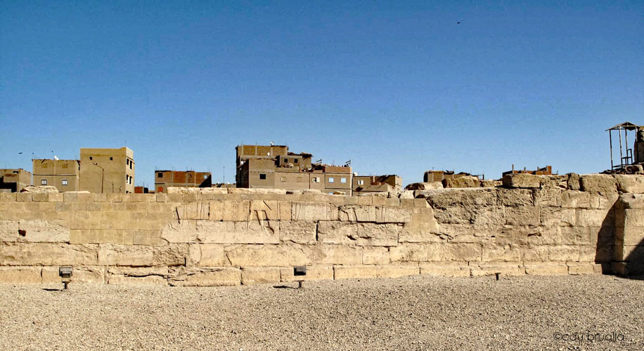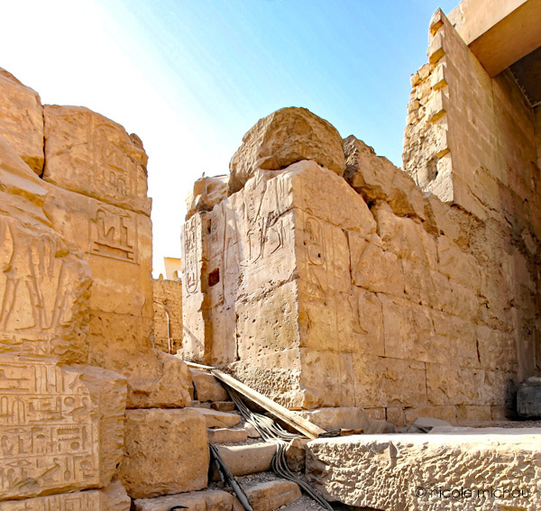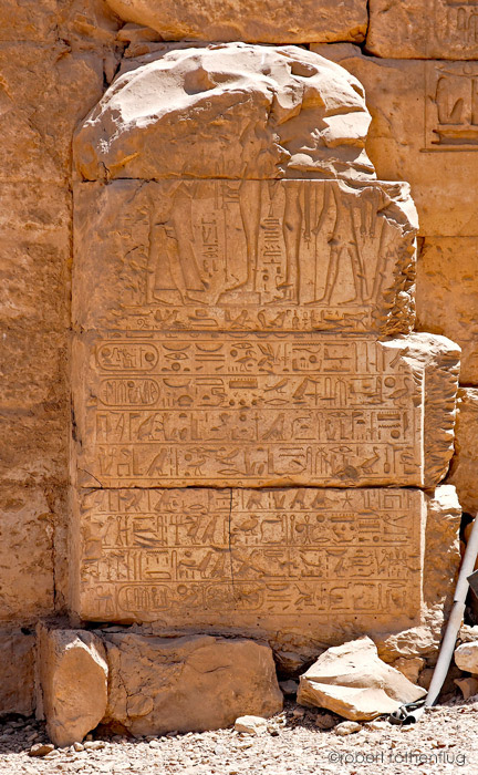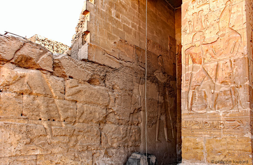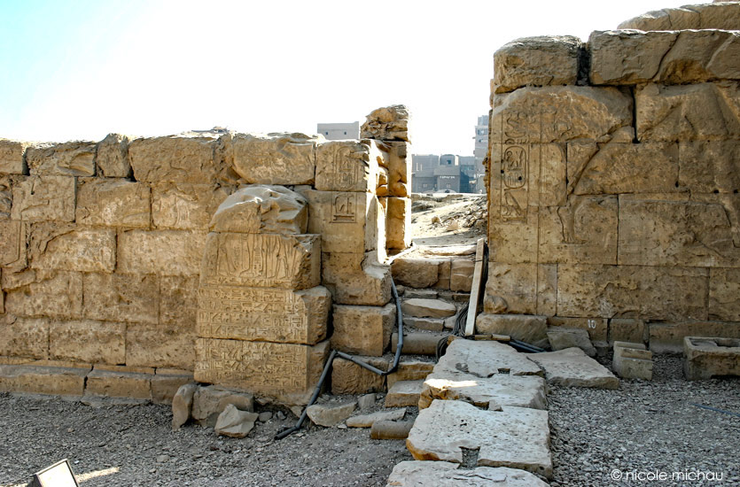 Une porte dans le mur permettait aux officiants les allées et venues entre le temple et les salles annexes et les magasins situés à l'extérieur du temple. À gauche, une stèle avec une scène d(offrande de la Maât. À droite, une scène très dégradée de massacre des ennemis.