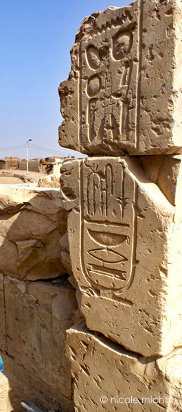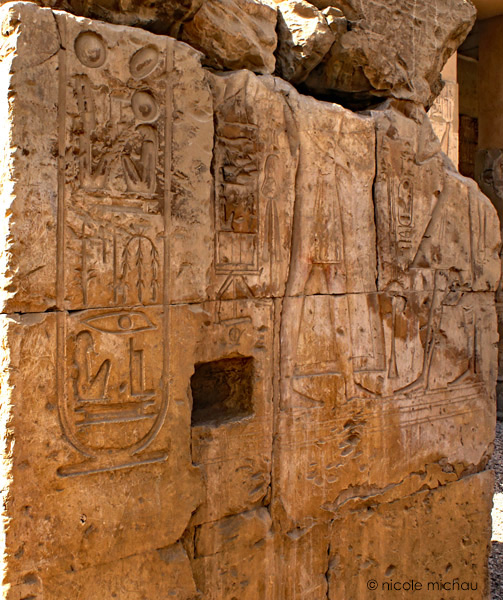 À gauche le cartouche est accompagné par une scène où Ramsès II suivi du Ka royal se tient devant Sethy 1er. À gauche, le grand cartouche avec le nom de Ramsès II se termine par "aimé d'Osiris" et à gauche par "aim" de Sokar".