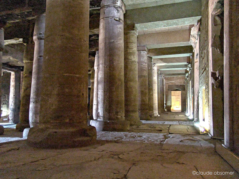 Chaque colonne est décorée de quatre scènes d'offrandes pour le dieu correspondant à la travée de la colonne. Sur la lignée des colonnes érigées sur la terrasse face à la paroi Ouest, ces scènes sont orientées de façon décalée par rapport aux 4 points cardinaux : nord-est, nord-ouest, sud-est, sud-ouest : ainsi aucune scène ne fait face aux scènes de la paroi Ouest. Sur les autres colonnes, les scènes sont orientées suivant les parois de ka salle, les 4 points cardinaux.