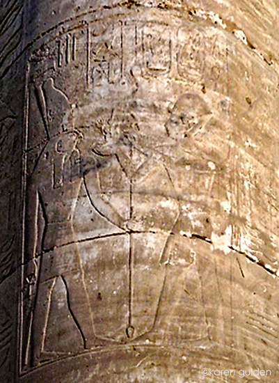 Le roi fait l'offrande de la Maât au dieu Horus.