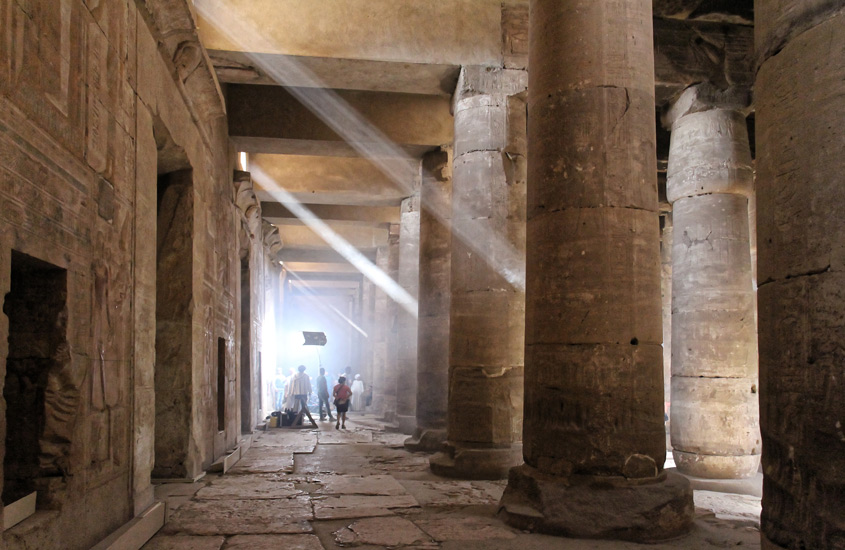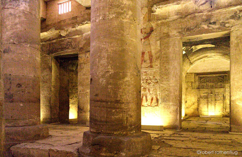 Les portes des chapelles sont situées sur la paroi Ouest, ici à gauche. Cette paroi est posée sur une terrasse d'environ 6 m. de laege sur laquelle se trouvent les 12 colonnes de la première rangée. Les prêtres y accédaient par des escaliers ou par des rampes pour ensuite pénétrer dans une chapelle et y célébrer le rituel.